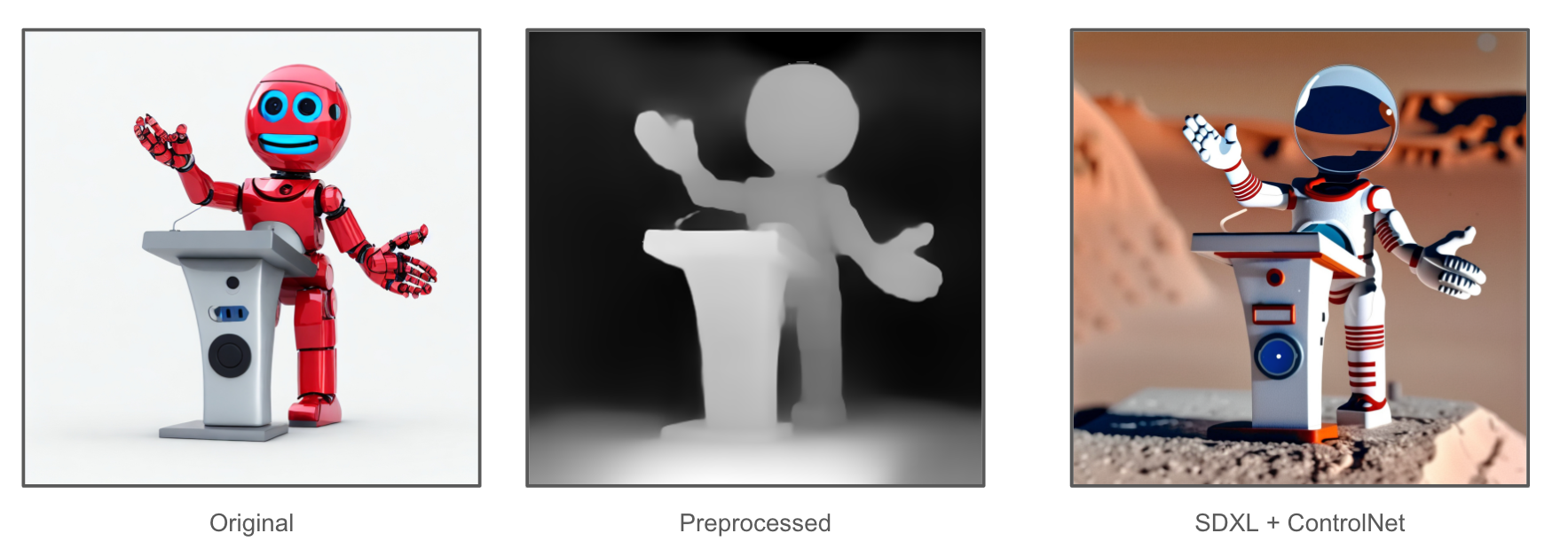 In this example, the image on the left side is the original image from the Internet. In the middle, it is the depth structure of the image, produced by Hyperbolic AI preprocessor. On the right, the image is generated using SDXL + ControlNet, seamlessly integrating depth information and the text prompt of "an astronaut on Mars". To explore this firsthand, utilize the following Python code: